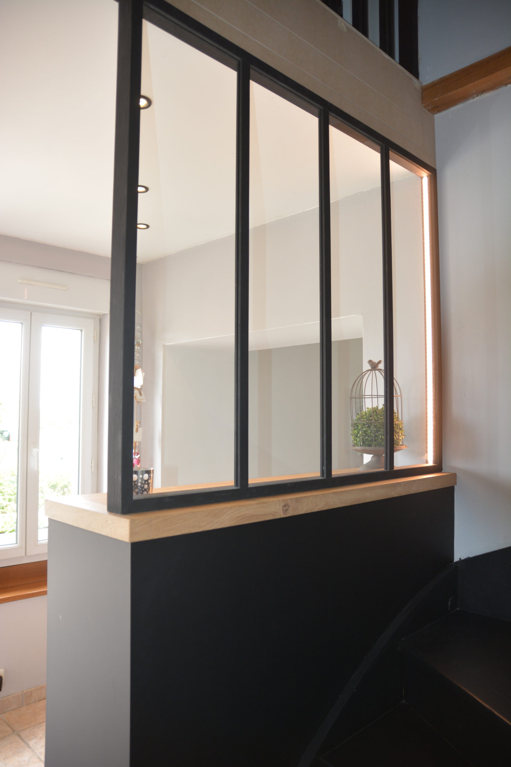 Meuble d’entrée sur mesure en stratifié noir mate avec verrière en chêne et plateau chêne massifs et led.